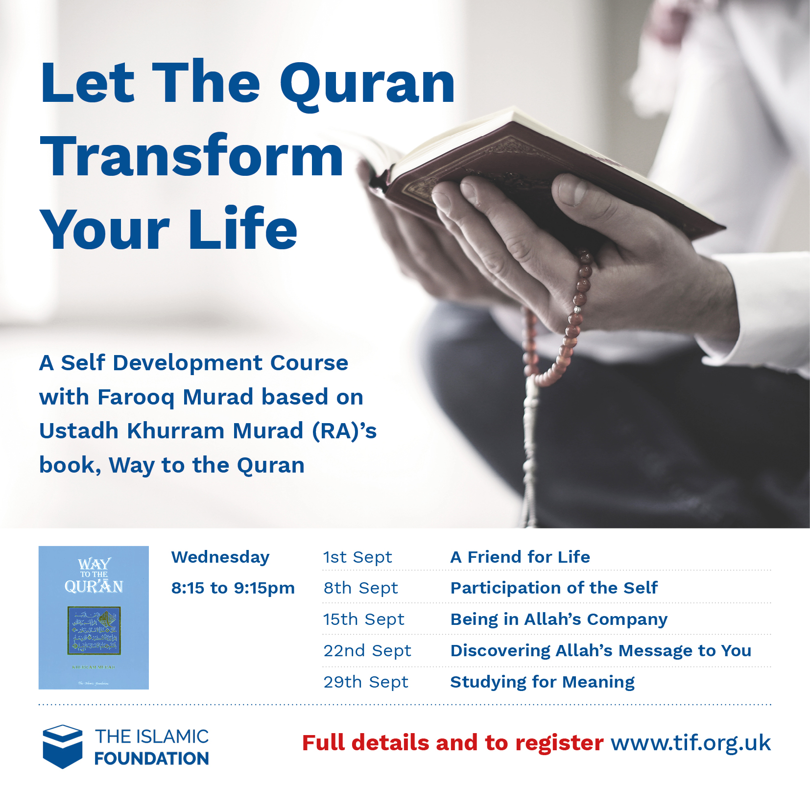 You will learn how to draw close to the Quran and let it do what it promises to do for anyone till the day of judgement: uplift, energize and guide.